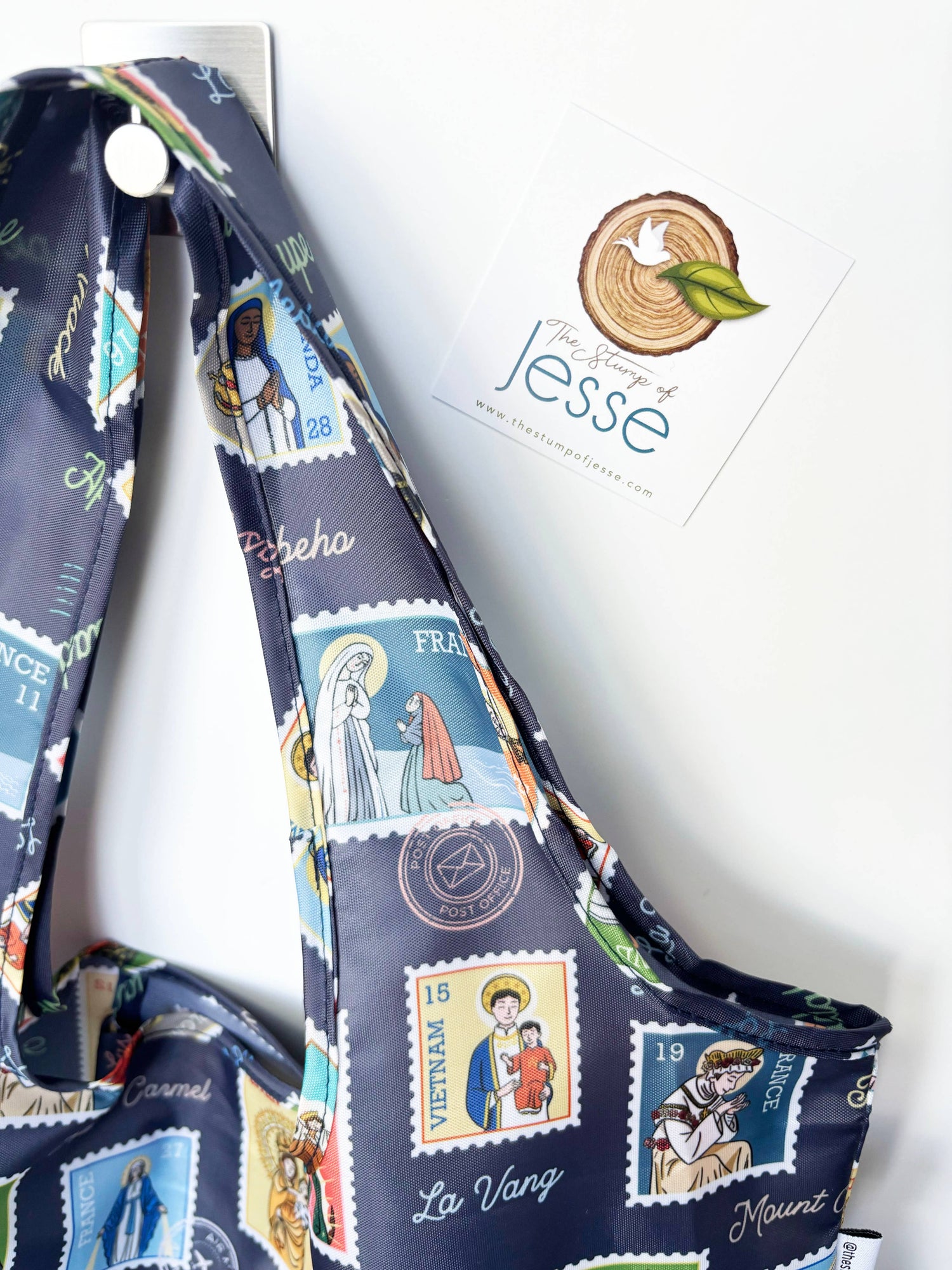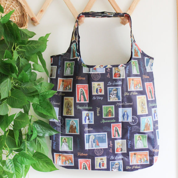 Bring your faith into everyday life with the Ave Maria Post Reusable Shopping Bag. This beautifully designed bag features a unique print of Catholic devotionals, including Our Lady of Guadalupe, Our Lady of Lourdes, Our Lady of Fatima, St. Clare of Assisi, the Eucharist (Carlo Acutis), and Marian postal stamp imagery.