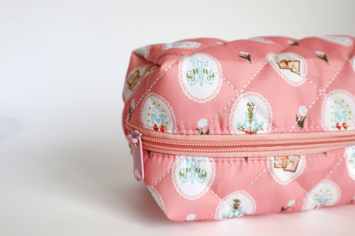 Quilted Pink Marian Pouch – Elegant Catholic Zipper Bag
