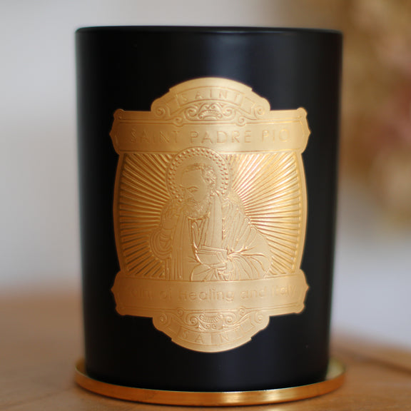 The legacy of Saint Padre Pio is one of marvel and comfort, inspiring a fragrance to match the divine nature of his life. This 14oz Padre Pio candle envelopes the senses with notes of amber, wood resins, frankincense, and sandalwood to create a balanced, uplifting scent.